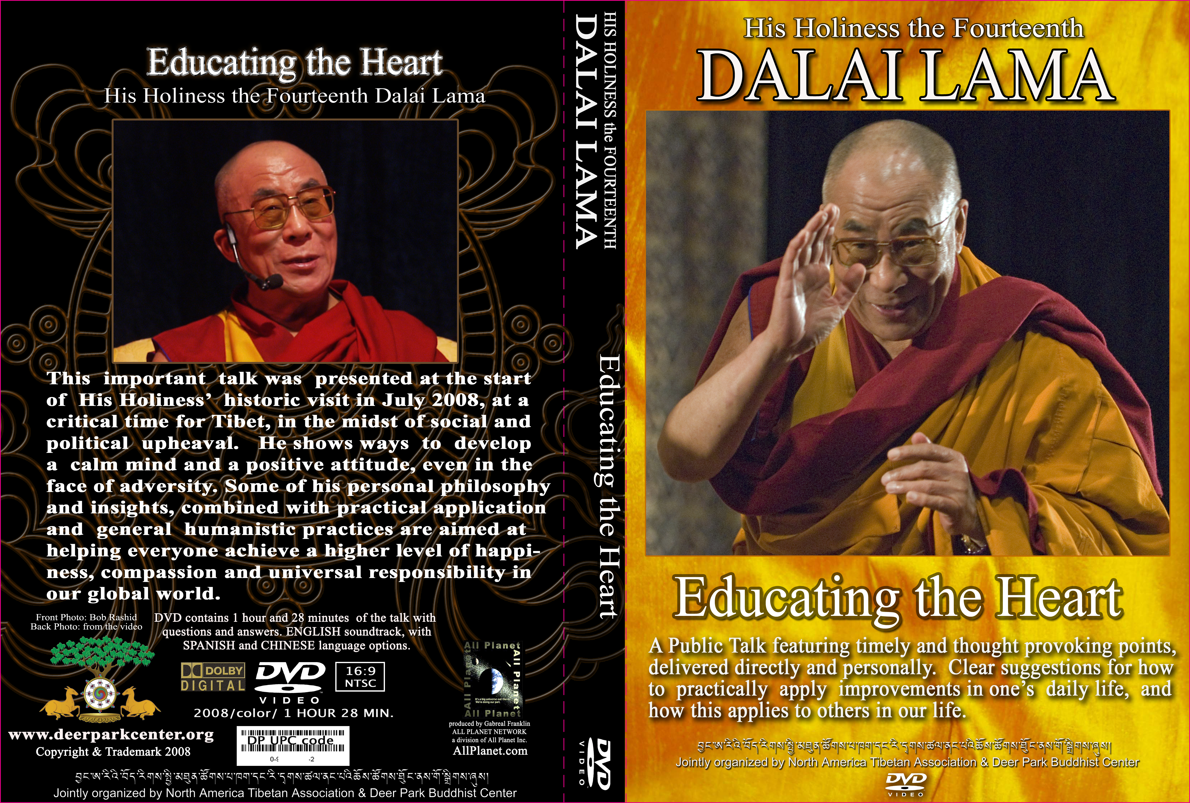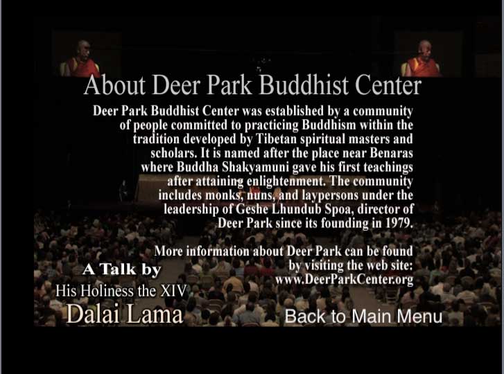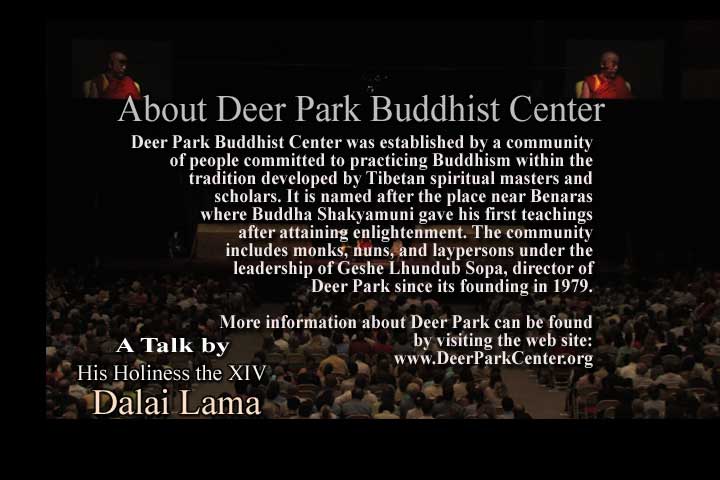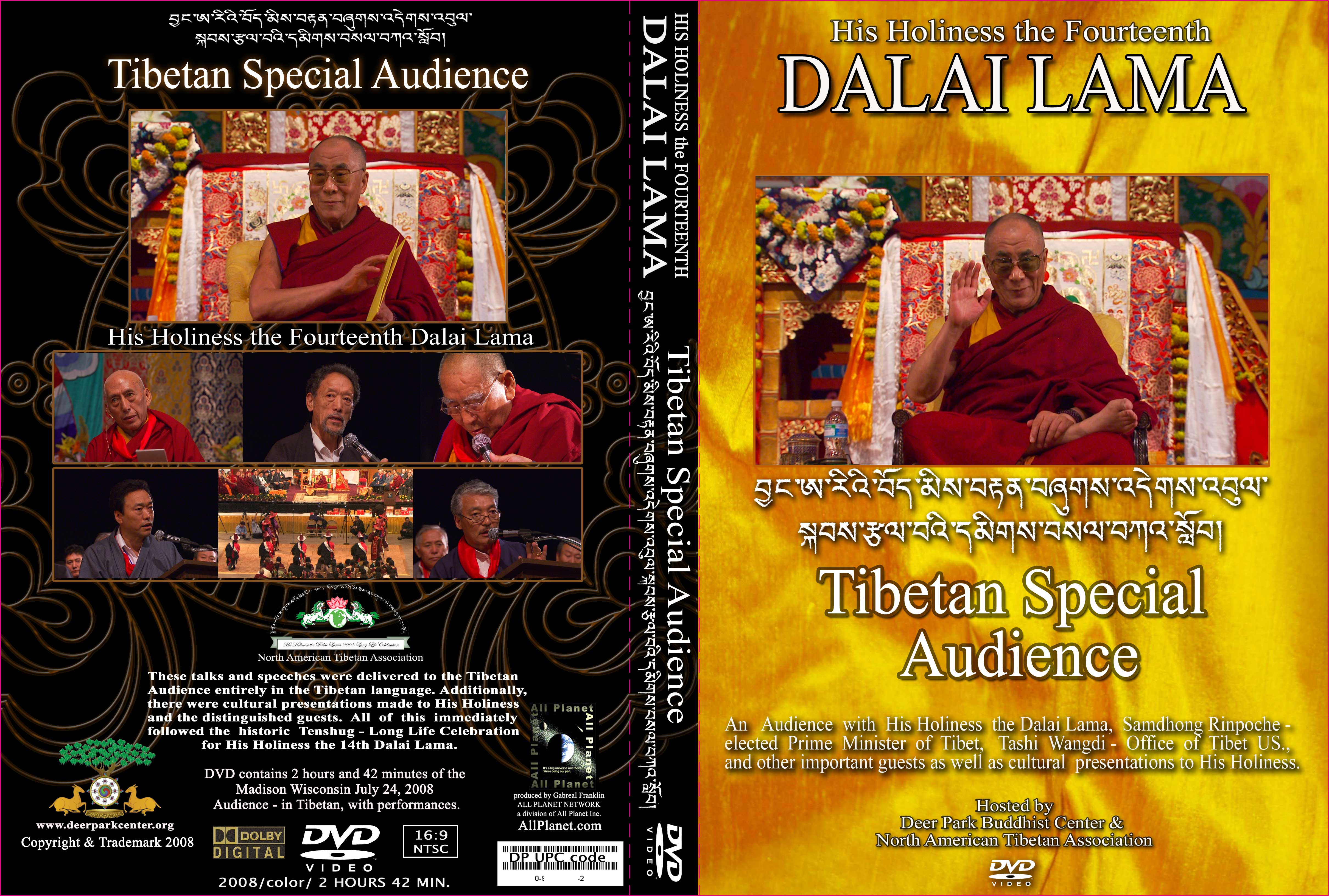 Credits on DVD (back): The members of the North American Tibetan Association and Deer Park Buddhist Center are extremely grateful to His Holiness the Fourteenth Dalai Lama for this *** comapassionate and timely public talk.