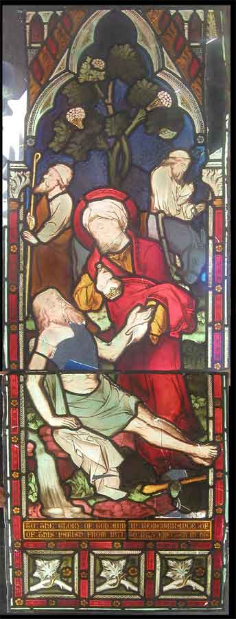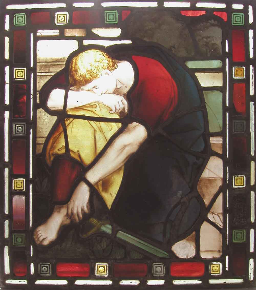 A Soldier rests by his sword after battle. This window has not yet been researched. The studio is possibly John Hardman Studios or possibly Sanders and Company. |