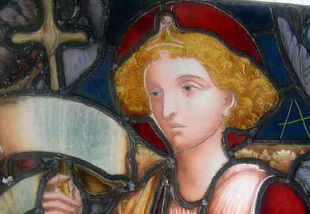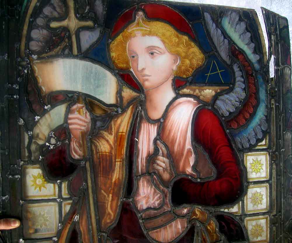 Panel Ca. 1860, Designer Sir Edward Burne-Jones, However the panel was made by Powell Studios, shortly before Burne-Jones began designing (almost) exclusively for and with his friend William Morris. Painting is much cruder than the later Morris Windows,