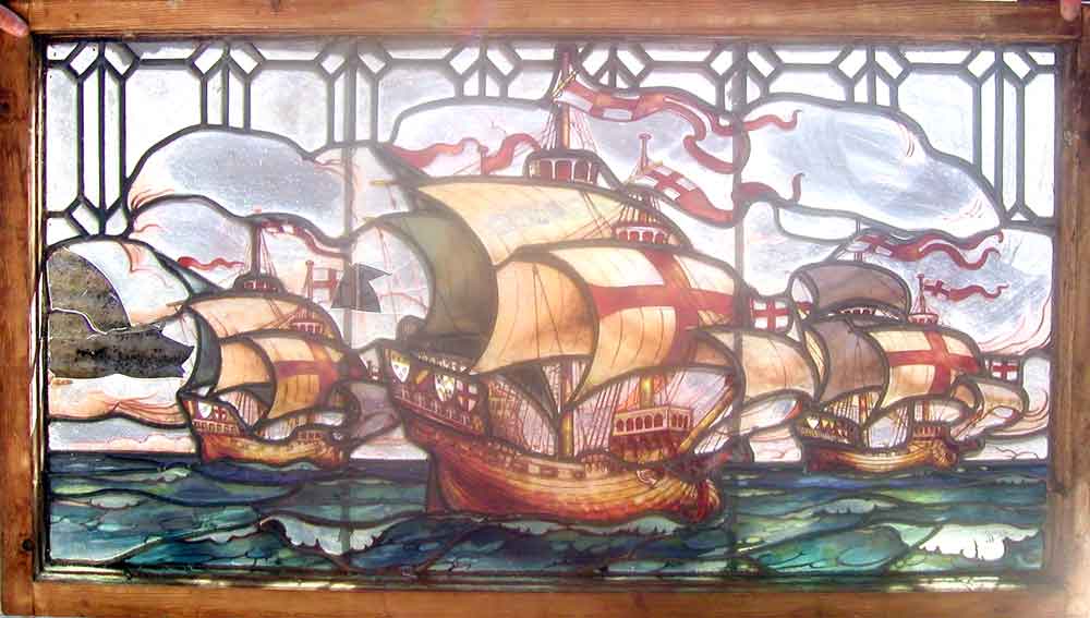This panel is English, ca. mid 1800's entitled COLUMBUS has some rare Ruby Glass etchings, then fired with Silver to make the gold colors. |